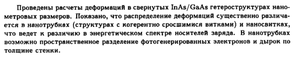 Проведены расчеты деформаций в свернутых InAs/GaAs гетероструктурах нано-метровых размеров. Показано, что распределение деформаций существенно различается в нанотрубках (структурах с когерентно сросшимися витками) и наносвитках, что ведет к различию в энергетическом спектре носителей заряда. В нанотрубках возможно пространственное разделение фотогенерированных электронов и дырок по толщине стенки.