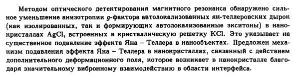 Методом оптического детектирования магнитного резонанса обнаружено сильное уменьшение анизотропии о-фактора автолокализованных ян-теллеровских дырок (как изолированных, так и формирующих автолокализованные экситоны) в нано-кристаллах AgCl, встроенных в кристаллическую решетку КС1. Это указывает на существенное подавление эффекта Яна Теллера в нанообъектах. Предложен механизм подавления эффекта Яна Теллера в нанокристаллах, связанный с действием дополнительного деформационного поля, которое возникает в нанокристалле благодаря значительному вибронному взаимодействию в области интерфейса.