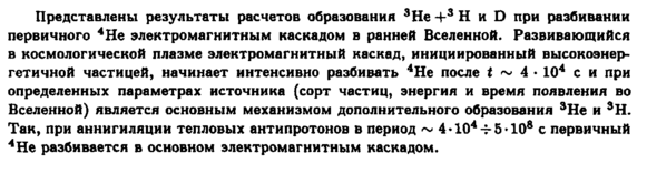 Представлены результаты расчетов образования 3Не +SH R D при разбивании первичного 4Не электромагнитным каскадом в ранней Вселенной. Развивающийся в космологической плазме электромагнитный каскад, инициированный высокоэнер-гетичной частицей, начинает интенсивно разбивать 4Не после < ~ 4 · 104 с и при определенных параметрах источника (сорт частиц, энергия и время появления во Вселенной) является основным механизмом дополнительного образования 'Не и 3Н. Так, при аннигиляции тепловых антипротонов в период ~ 4·104-=-5·108 с первичный 4Не разбивается в основном электромагнитным каскадом.