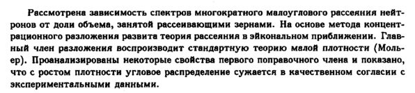 Рассмотрена зависимость спектров многократного малоуглового рассеяния нейтронов от доли объема, занятой рассеивающими зернами. На основе метода концентрационного разложения развита теория рассеяния в эйкональном приближении. Главный член разложения воспроизводит стандартную теорию малой плотности (Мольер). Проанализированы некоторые свойства первого поправочного члена и показано, что с ростом плотности угловое распределение сужается в качественном согласии с экспериментальными данными.