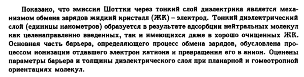 Показано, что эмиссия Шоттки через тонкий слой диэлектрика является механизмом обмена зарядов жидкий кристалл (ЖК) электрод. Тонкий диэлектрический слой (единицы нанометров) образуется в результате адсорбции нейтральных молекул как целенаправленно введенных, так и имеющихся даже в хорошо очищенных ЖК. Основная часть барьера, определяющего процесс обмена зарядов, обусловлена процессом ионизации отдавшего электрон катиона и превращения его в анион. Оценены параметры барьера и толщины диэлектрического слоя при пленарной и гомеотропной ориентациях молекул.