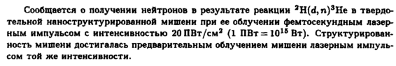 Сообщается о получении нейтронов в результате реакции 2H(d, п)3Не в твердотельной наноструктурнрованной мишени при ее облучении фемтосекундным лазерным импульсом с интенсивностью 20ПВт/см2 (1 ПВт = 1015 Вт)> Структурированность мишени достигалась предварительным облучением мишени лазерным импульсом той же интенсивности.