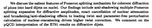 We discuss the salient features of Pomeron splitting mechanism for coherent diffraction of pions into hard dijets on nuclei. Our findings include anti-shadowing multiple-Pomeron splitting expansion for diffractive amplitudes, exact cancellation of nuclear attenuation and broadening/anti-shadowing effects to leading twist and parameter-free perturbative calculation of nuclear-rescattering driven higher twist correction. We comment on the pQCD interpretation of the E791 results on diffractive dijets.