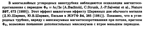 В многослойных углеродных нанотрубках наблюдаются осцилляции магнитосо-противления с периодом Фо — hc/2e (A.Bachtold, С.Strunk, J.-P.Salvetat et al., Nature 307, 673 (1999)). Этот эффект аналогичен эффекту Шарвиных для обычного металла (Д.Ю.Шарвин, Ю.В.Шарвин, Письма в ЖЭТФ 34, 285 (1981)). Показано, что в углеродных трубках, наряду с максимумами магнитосопротивления при потоке, кратном Фо, возможно появление дополнительных максимумов с втрое меньшим периодом.