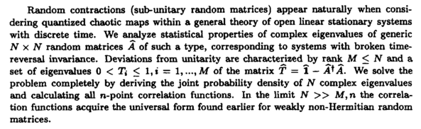 Random contractions (sub-unitary random matrices) appear naturally when considering quantized chaotic maps within a general theory of open linear stationary systems with discrete time. We analyze statistical properties of complex eigenvalues of generic Ν χ N random matrices A of such a type, corresponding to systems with broken time-reversal invariance. Deviations from unitarity are characterized by rank Af < N and a set of eigenvalues 0 < T* < 1, i — 1,..., Μ of the matrix Τ = 1 — A*A. We solve the problem completely by deriving the joint probability density of N complex eigenvalues and calculating all η-point correlation functions. In the limit Ν » M,n the correlation functions acquire the universal form found earlier for weakly non-Hermitian random matrices.