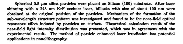 Spherical 0.5 μνα silica particles were placed on Silicon (100) substrate. After laser shinning with a 248 nm KrF excimer laser, hillocks with size of about 100 nm were obtained at the original position of the particles. Mechanism of the formation of the sub-wavelength structure pattern was investigated and found to be the near-field optical resonance effect induced by particles on surface. Theoretical calculation result of the near-field light intensity distribution was presented, which was in agreement with the experimental result. The method of particle enhanced laser irradiation has potential applications in nanolithography.