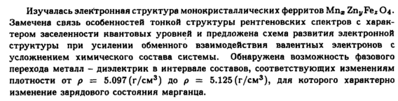 Изучалась электронная структура монокристаллических ферритов Mnx ZnyFe* О4. Замечена связь особенностей тонкой структуры рентгеновских спектров с характером заселенности квантовых уровней и предложена схема развития электронной структуры при усилении обменного взаимодействия валентных электронов с усложнением химического состава системы. Обнаружена возможность фазового перехода металл диэлектрик в интервале составов, соответствующих изменениям плотности от ρ = 5.097 (г/см3) до ρ = 5.125 (г/см3), для которого характерно изменение зарядового состояния марганца.