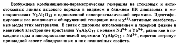 Возбуждена комбинационно-параметрическая генерация на стоксовых и антистоксовых линиях высокого порядка в видимом и ближнем ИК диапазонах в монокристаллах Y3AI5O12 и одноименной нанокристаллической керамике. Идентифицированы все компоненты обнаруженной генерации как и х(3'-активные колебательные моды этих материалов. В связи с широким использованием в лазерной физике и квантовой электронике кристаллов Y3AI5O12 с ионами Nds+ и Yb3+, равно как в последние годы и нанокристаллической керамики Y3AI5O12 : Nd3+, коротко затронут прикладной аспект обнаруженных в них нелинейных свойств.