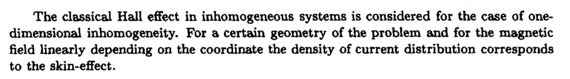 The classical Hall effect in inhomogeneous systems is considered for the case of one-dimensional inhomogeneity. For a certain geometry of the problem and for the magnetic field linearly depending on the coordinate the density of current distribution corresponds to the skin-eflFect.
