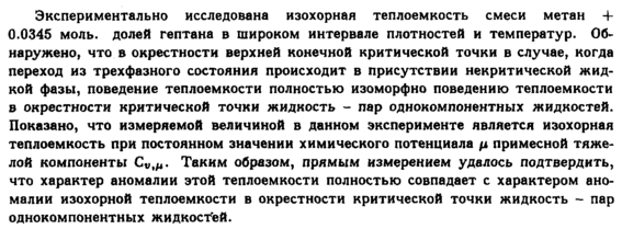 Экспериментально исследована изохорная теплоемкость смеси метан + 0.0345 моль, долей гептана в широком интервале плотностей и температур. Обнаружено, что в окрестности верхней конечной критической точки в случае, когда переход из трехфазного состояния происходит в присутствии некритической жидкой фазы, поведение теплоемкости полностью изоморфно поведению теплоемкости в окрестности критической точки жидкость пар однокомпонентных жидкостей. Показано, что измеряемой величиной в данном эксперименте является изохорная теплоемкость при постоянном значении химического потенциала μ примесной тяжелой компоненты Ον,μ. Таким образом, прямым измерением удалось подтвердить, что характер аномалии этой теплоемкости полностью совпадает с характером аномалии изохорной теплоемкости в окрестности критической точки жидкость пар однокомпонентных жидкостей.