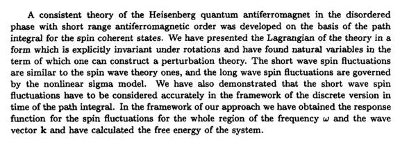 A consistent theory of the Heisenberg quantum antiferromagnet in the disordered phase with short range antiferromagnetic order was developed on the basis of the path integral for the spin coherent states. We have presented the Lagrangian of the theory in a form which is explicitly invariant under rotations and have found natural variables in the term of which one can construct a perturbation theory. The short wave spin fluctuations are similar to the spin wave theory ones, and the long wave spin fluctuations are governed by the nonlinear sigma model. We have also demonstrated that the short wave spin fluctuations have to be considered accurately in the framework of the discrete version in time of the path integral. In the framework of our approach we have obtained the response function for the spin fluctuations for the whole region of the frequency ω and the wave vector k and have calculated the free energy of the system.