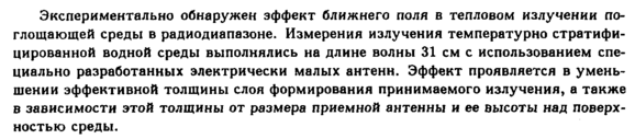 Экспериментально обнаружен эффект ближнего поля в тепловом излучении поглощающей среды в радиодиапазоне. Измерения излучения температурно стратифицированной водной среды выполнялись на длине волны 31 см с использованием специально разработанных электрически малых антенн. Эффект проявляется в уменьшении эффективной толщины слоя формирования принимаемого излучения, а также в зависимости этой толщины от размера приемной антенны и ее высоты над поверхностью среды.