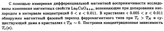 С помощью измерения дифференциальной магнитной восприимчивости исследованы изменения магнитных свойств ЬагСиС^+а, возникающие при допировании кислородом в интервале концентраций 0 < χ < 0.011. В кристаллах с 0.005 < χ < 0.011 обнаружен магнитный фазовый переход ферромагнитного типа при Тс > Τχ и существующий даже в кристаллах с Tjv ~ 0. Построена концентрационная зависимость Те(х).