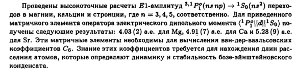 Проведены высокоточные расчеты .El-амплитуд 3,1 Р£(п$пр) —> 1 Sofas2) переходов в магнии, кальции и стронции, где η = 3,4,5, соответственно. Для приведенного матричного элемента оператора электрического дипольного момента (1Ρ{>||<ί||15ο) получены следующие результаты: 4.03 (2) а.е. для Mg, 4.91 (7) а.е. для Са и 5.28 (9) а.е. для Sr. Эти матричные элементы необходимы для вычисления ван-дер-ваальсовских коэффициентов Cq. Знание этих коэффициентов требуется для нахождения длин рассеяния атомов, которые определяют динамику и стабильность бозе-эйнштейновского конденсата.