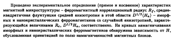 Проведено экспериментальное определение (прямое и косвенное) характеристик магнитной микроструктуры ферромагнитный корреляционный радиус Л/, среднеквадратичная флуктуация средней анизотропии в этой области D1/2(H0) аморфных и нанокристаллических ферромагнетиков со случайной анизотропией, характеризующейся величинами Rc, D1^2Ha, соответственно. На кривых намагничивания аморфных и нанокристаллических ферромагнетиков обнаружена зависимость от Н, обусловленная ориентацией по полю намагниченностей магнитных блоков.