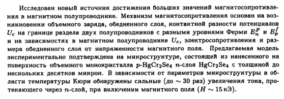 Исследован новый источник достижения больших значений магнитосопротивле-ния в магнитном полупроводнике. Механизм магнитосопротивления основан на возникновении объемного заряда, обедненного слоя, контактной разности потенциалов uc на границе раздела двух полупроводников с разными уровнями Ферми и е(, и на зависимостях в магнитном полупроводнике uc, электросопротивления и размера обедненного слоя от напряженности магнитного поля. Предлагаемая модель экспериментально подтверждена на микроструктуре, состоящей из нанесенного на поверхность объемного монокристалла p-HgCr2Se4 η-слоя HgCr2Se4 с толщиной до нескольких десятков микрон. В зависимости от параметров микроструктуры в области температуры Кюри обнаружены сильные (до ~ 30 раз) увеличения тока, протекающего через η-слой, при включении магнитного поля (Я ~ 15 кЭ).