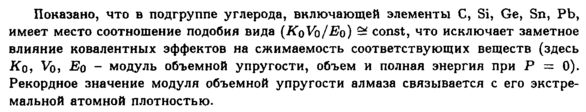 Показано, что в подгруппе углерода, включающей элементы С, Si, Ge, Sn, Pb, имеет место соотношение подобия вида (KqVq/Eq) 9ί const, что исключает заметное влияние ковалентных эффектов на сжимаемость соответствующих веществ (здесь Koj VO, Eq модуль объемной упругости, объем и полная энергия при ρ — 0). Рекордное значение модуля объемной упругости алмаза связывается с его экстремальной атомной плотностью.