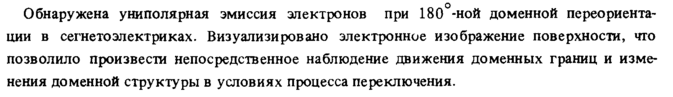 Обнаружена униполярная эмиссия электронов при 180 -ной доменной переориентации в сегнетоэлектриках. Визуализировано электронное изображение поверхности, что позволило произвести непосредственное наблюдение движения доменных границ и изменения доменной структуры в условиях процесса переключения.
