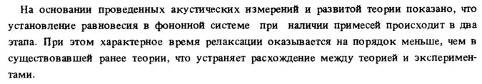 На основании проведенных акустических измерений и развитой теории показано, что установление равновесия в фононной системе при наличии примесей происходит в два этапа. При этом характерное время релаксации оказывается на порядок меньше, чем в существовавшей ранее теории, что устраняет расхождение между теорией и экспериментами.