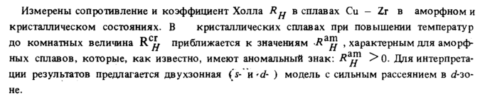 Измерены сопротивление и коэффициент Холла R^ в сплавах Си Zr в аморфном и кристаллическом состояниях. В кристаллических сплавах при повышении температур до комнатных величина RC# приближается к значениям > характерным для аморфных сплавов, которые, как известно, имеют аномальный знак: R^ >0. Для интерпретации результатов предлагается двухзонная (*jyи <d) модель с сильным рассеянием в d-ъо-не.