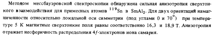 Методом мессбауэровской спектроскопии обнаружена сильная анизотропия сверхтонкого взаимодействия для примесных атомов 119Sn в SmAl2. Для двух ориентаций намагниченности относительно локальной оси симметрии (под углами 0 и 70°) при температуре 5 К магнитные сверхтонкие поля равны соответственно 16,3 и 18,9 Т. Анизотропия отражает несферичность распределения 4/-электронов иона самария.