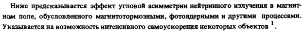 Ниже предсказывается эффект угловой асимметрии нейтринного излучения в магнитном поле, обусловленного магнитотормозными, фотоядерными и другими процессами. Указывается на возможность интенсивного самоускорения некоторых объектов !.