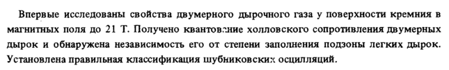 Впервые исследованы свойства двумерного дырочного газа у поверхности кремния в магнитных поля до 21 Т. Получено квантовлние холловского сопротивления двумерных дырок и обнаружена независимость его от степени заполнения подзоны легких дырок. Установлена правильная классификация шубниковских осцилляций.