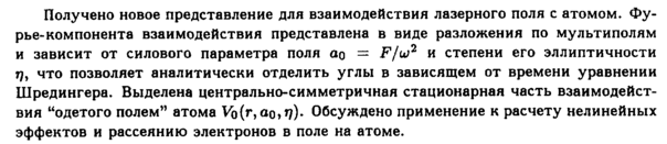 Получено новое представление для взаимодействия лазерного поля с атомом. Фурье-компонента взаимодействия представлена в виде разложения по мультиполям и зависит от силового параметра поля ао = F/ω2 и степени его эллиптичности г), что позволяет аналитически отделить углы в зависящем от времени уравнении Шредингера. Выделена центрально-симметричная стационарная часть взаимодействия "одетого полем" атома Vo(r,ao,T/)Обсуждено применение к расчету нелинейных эффектов и рассеянию электронов в поле на атоме.