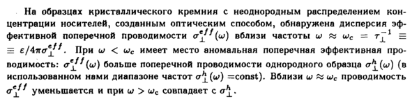На образцах кристаллического кремния с неоднородным распределением концентрации носителей, созданным оптическим способом, обнаружена дисперсия эффективной поперечной проводимости σ°^^(ω) вблизи частоты ω й шс = τ^' Ξ ΞΞ ε/4πσ'±^. При ω < шс имеет место аномальная поперечная эффективная проводимость: аСу^(ω) больше поперечной проводимости однородного образца σχ(ω) (в использованном нами диапазоне частот σχ(α>) =const). Вблизи ω fa шс проводимость уменьшается и при ω > шс совпадает с σχ.