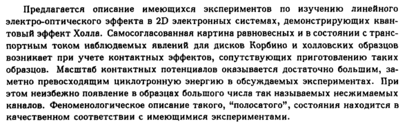 Предлагается описание имеющихся экспериментов по изучению линейного электро-оптического эффекта в 2D электронных системах, демонстрирующих квантовый эффект Холла. Самосогласованная картина равновесных и в состоянии с транспортным током наблюдаемых явлений для дисков Корбино и холловских образцов возникает при учете контактных эффектов, сопутствующих приготовлению таких образцов. Масштаб контактных потенциалов оказывается достаточно большим, заметно превосходящим циклотронную энергию в обсуждаемых экспериментах. При этом неизбежно появление в образцах большого числа так называемых несжимаемых каналов. Феноменологическое описание такого, "полосатого", состояния находится в качественном соответствии с имеющимися экспериментами.