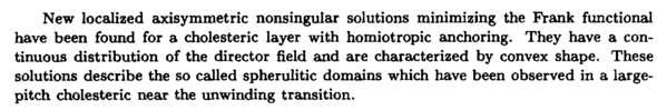 New localized axisymmetric nonsingular solutions minimizing the Frank functional have been found for a cholesteric layer with homiotropic anchoring. They have a continuous distribution of the director field and are characterized by convex shape. These solutions describe the so called spherulitic domains which have been observed in a large-pitch cholesteric near the unwinding transition.