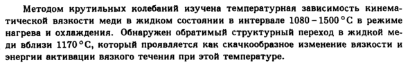 Методом крутильных колебаний изучена температурная зависимость кинематической вязкости меди в жидком состоянии в интервале 1080-1500°С в режиме нагрева и охлаждения. Обнаружен обратимый структурный переход в жидкой меди вблизи 1170° С, который проявляется как скачкообразное изменение вязкости и энергии активации вязкого течения при этой температуре.