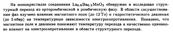 На монокристалле соединения Ьао.вВао.гМпОз обнаружен и исследован структурный переход из орторомбической в ромбическую фазу. В области сосуществования фаз изучено влияние магнитного поля (до 12 Тл) и гидростатического давления (до 5 кбар) на температурные зависимости электросопротивления. Показано, что магнитное поле и давление понижают температуру перехода и качественно одинаково влияют на электросопротивление в области структурного перехода.