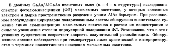 В двойных GaAs/AlGaAs квантовых ямах (п г η структуры) исследованы спектры фотолюминесценции (ФЛ) межъямных экситонов, у которых связанные электрон и дырка пространственно разделены узким AlAs барьером. При резонансном возбуждении циркулярно поляризованным светом обнаружено значительное сужение линии люминесценции межъямных экситонов с ростом их концентрации и сильное увеличение степени циркулярной поляризации ФЛ. Установлено, что в этих условиях существенно возрастает скорость излучательной рекомбинации. Обнаруженное явление наблюдается при температурах ниже критической и интерпретируется в терминах коллективного поведения межъямных экситонов.