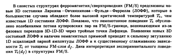 В слоистых структурах ферромагнетик/сверхпроводник (FM/S) предсказаны новые 3D состояния Ларкина-Овчинникова Фульде -Феррелла (ЛОФФ), которые в большинстве случаев обладают более высокой критической температурой Тс, чем известные 1D состояния ЛОФФ. Показано, что немонотонное поведение Тс обусловлено колебаниями потока куперовских пар на FM/S-границе, возникающими из-за фазовых переходов 3D-1D-3D через тройные точки Лифшица. Появление новых 3D состояний ЛОФФ и наличие немагнитных примесей приводят к сильному затуханию 1D осцилляций парной амплитуды ЛОФФ и к существенному сглаживанию зависимости Тс от толщины FM-слоя df. Дана интерпретация экспериментального поведения Tc(df) в структурах FM/S.