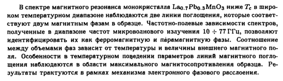 В спектре магнитного резонанса монокристалла Ьао.7РЬо.зМпОз ниже Тс в широком температурном диапазоне наблюдаются две линии поглощения, которые соответствуют двум магнитным фазам в образце. Частотно-полевые зависимости спектров, полученные в диапазоне частот микроволнового излучения 10 -г 77 ГГц, позволяют идентифицировать их как ферромагнитную и парамагнитную фазы. Соотношение между объемами фаз зависит от температуры и величины внешнего магнитного поля. Особенности в температурном поведении параметров линий магнитного поглощения наблюдаются в области максимального магнитосопротивления образца. Результаты трактуются в рамках механизма электронного фазового расслоения.