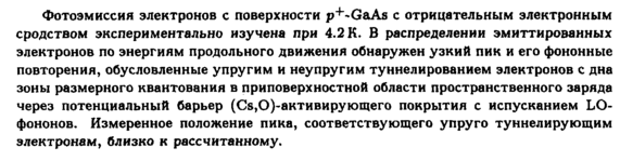Фотоэмиссия электронов с поверхности p+~GaAs с отрицательным электронным сродством экспериментально изучена при 4.2 К. В распределении эмиттированных электронов по энергиям продольного движения обнаружен узкий пик и его фононные повторения, обусловленные упругим и неупругим туннелированием электронов с дна зоны размерного квантования в приповерхностной области пространственного заряда через потенциальный барьер (С&,0)-активирующего покрытия с испусканием LO-фононов. Измеренное положение пика, соответствующего упруго туннелирующим электронам, близко к рассчитанному.