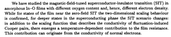 We have studied the magnetic-field-tuned superconductor-insulator transition (SIT) in amorphous In-O films with different oxygen content and, hence, different electron density. While for states of the film near the zero-field SIT the two-dimensional scaling behaviour is confirmed, for deeper states in the superconducting phase the SIT scenario changes: in addition to the scaling function that describes the conductivity of fluctuation-induced Cooper pairs, there emerges a temperature-dependent contribution to the film resistance. This contribution can originate from the conductivity of normal electrons.