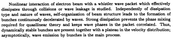 Nonlinear interaction of electron beam with a whistler wave packet which effectively dissipates through collisions or wave leakage is studied. Independently of dissipation type and nature of waves, self-organization of beam structure leads to the formation of bunches continuously decelerated by waves. Strong dissipation prevents the phase mixing required for quasilinear theory and keeps wave phases in the packet correlated. Thus, dynamically stable bunches are present together with a plateau in the velocity distribution; asymptotically, wave emission by bunches is the main process.