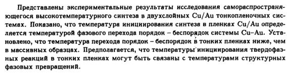 Представлены экспериментальные результаты исследования самораспространяющегося высокотемпературного синтеза в двухслойных Cu/Au тонкопленочных системах. Показано, что температура инициирования синтеза в пленках Cu/Au определяется температурой фазового перехода порядок беспорядок системы Cu-Au. Установлено, что температура перехода порядок беспорядок в тонких пленках ниже, чем в массивных образцах. Предполагается, что температуры инициирования твердофазных реакций в тонких пленках могут быть связаны с температурами структурных фазовых превращений.