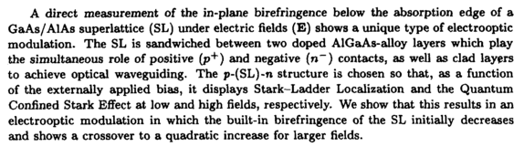 A direct measurement of the in-plane birefringence below the absorption edge of a GaAs/AlAs superlattice (SL) under electric fields (E) shows a unique type of electrooptic modulation. The SL is sandwiched between two doped AlGaAs-alloy layers which play the simultaneous role of positive (p+) and negative (n~) contacts, as well as clad layers to achieve optical waveguiding. The p-(SL)-n structure is chosen so that, as a function of the externally applied bias, it displays Stark-Ladder Localization and the Quantum Confined Stark Effect at low and high fields, respectively. We show that this results in an electrooptic modulation in which the built-in birefringence of the SL initially decreases and shows a crossover to a quadratic increase for larger fields.