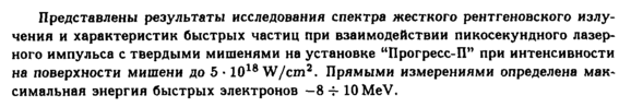 Представлены результаты исследования спектра жесткого рентгеновского излучения и характеристик быстрых частиц при взаимодействии пикосекундного лазерного импульса с твердыми мишенями на установке "Прогресс-П" при интенсивности на поверхности мишени до 5 ■ 1018 W/cm2. Прямыми измерениями определена максимальная энергия быстрых электронов —8 ~ 10 MeV,