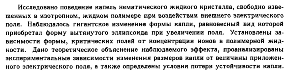 Исследовано поведение капель нематического жидкого кристалла, свободно взвешенных в изотропном, жидком полимере при воздействии внешнего электрического поля. Наблюдалось гигантское изменение формы капли, равновесный вид которой приобретал форму вытянутого эллипсоида при увеличении поля. Установлены зависимости формы, критических полей от концентрации ионов в полимерной жидкости. Дано теоретическое объяснение наблюдаемого эффекта, проанализированы экспериментальные зависимости изменения размеров капли от величины приложенного электрического поля, а также определены условия потери устойчивости капли.