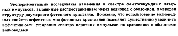 Экспериментально исследованы изменения в спектре фемтосекундных лазерных импульсов, вызванные распространением через волновод с оболочкой, имеющей структуру двумерного фотонного кристалла. Показано, что использование волновод-ных свойств дефектных мод фотонных кристаллов позволяет существенно увеличить эффективность уширения спектра коротких импульсов по сравнению с обычными волноводами.