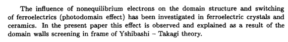 The influence of nonequilibrium electrons on the domain structure and switching of ferroelectrics (photodomain effect) has been investigated in ferroelectric crystals and ceramics. In the present paper this effect is observed and explained as a result of the domain walls screening in frame of Yshibashi Takagi theory.