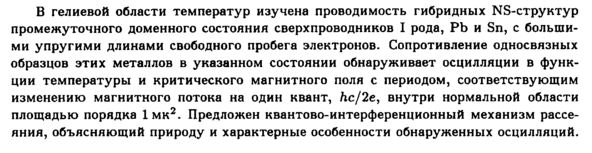 В гелиевой области температур изучена проводимость гибридных NS-структур промежуточного доменного состояния сверхпроводников I рода, РЬ и Sn, с большими упругими длинами свободного пробега электронов. Сопротивление односвязных образцов этих металлов в указанном состоянии обнаруживает осцилляции в функции температуры и критического магнитного поля с периодом, соответствующим изменению магнитного потока на один квант, Лс/2е, внутри нормальной области площадью порядка 1мк2. Предложен квантово-интерференционный механизм рассеяния, объясняющий природу и характерные особенности обнаруженных осцилляций.