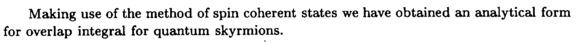 Making use of the method of spin coherent states we have obtained an analytical form for overlap integral for quantum skyrmions.