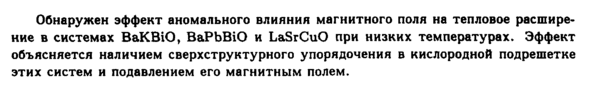 Обнаружен эффект аномального влияния магнитного поля на тепловое расширение в системах ВаКВЮ, BaPbBiO и LaSrCuO при низких температурах. Эффект объясняется наличием сверхструктурного упорядочения в кислородной подрешетке этих систем и подавлением его магнитным полем.