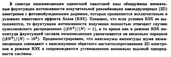 В спектре люминесценции одиночной квантовой ямы обнаружены аномальные флуктуации интенсивности излучательной рекомбинации квазидвумерных (2D) электронов с фотовозбужденными дырками, которые проявляются исключительно в условиях квантового эффекта Холла (КЭХ). Показано, что если условия КЭХ не выполняются, то флуктуации интенсивности излучения полностью отвечают случаю пуассоновского распределения ((δΝ2)/{Ν) = 1), в то время как в режиме КЭХ амплитуда флуктуаций сигнала люминесценции увеличивается на несколько порядков ((SN2)/{N) ~ 102). Продемонстрировано, что максимумы амплитуды шума люминесценции совпадают с максимумами обратного магнитосопротивления 2D электронов в режиме КЭХ и сопровождаются установлением аномально высокой однородности системы.