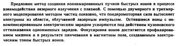 Предложен метод создания коллимированных пучков быстрых ионов в процессе взаимодействия лазерного излучения с плазмой. С помощью двумерного и трехмерного моделирования методом частиц показано, что пондеромоторная сила вытесняет электроны из области, облучаемой лазерным импульсом. Оставшиеся ионы с некомпенсированным электрическим зарядом ускоряются под действием кулоновского отталкивания одноименных зарядов. Фокусировка ионов достигается профилированием мишени и в результате пинчевания в магнитном поле, создаваемым электрическим током быстрых ионов.
